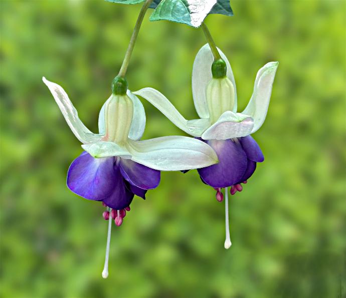 Der Tubus ist weiß und hat grüne Streifen. Das Laub und der Aufbau der Pflanze ist sehr kräftig. Bei der Überwinterung ist diese Fuchsie recht problemlos. Man muss nur aufpassen, dass sie nicht zu feucht steht.