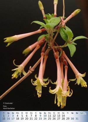 Diese Art von der Hemsleyella-Sektion ist noch nicht so lange in Europa. Aus den Knollen kommen viele Triebe, die sich schlecht verzweigen. Am Ende dieser Triebe enstehen schon in Januar kleine Trauben kleiner Knospen. Bis zur Blüte dauert es aber noch bis April/Mai. Sie sind nicht groß, ungefähr 2,5 cm, und haben eine schöne Pastellfarbe, wahrscheinlich weil sie im Gewächshaus nicht so viel Licht haben wie draußen. Über Sommer hat man leider nur Laub, denn alle Knollenfuchsienblühen nur am Ende des Winters im Gewächshaus.