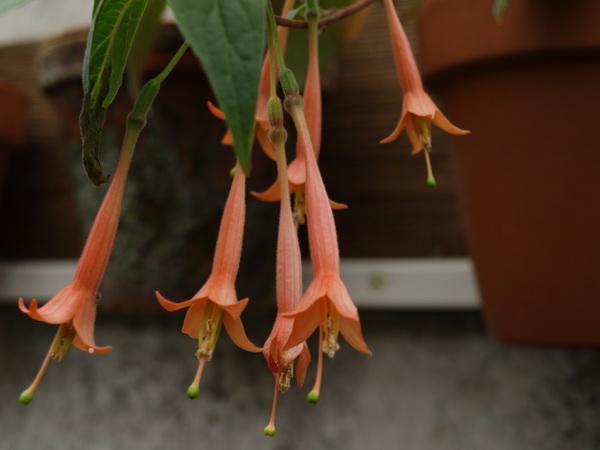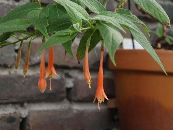 F. cestroides bildet bis zu 3 m hohe Sträucher, aufrecht oder leicht überhängend. Die Blüten sind mit ca. 2.5 cm etwas kleiner und stehen in Büscheln beieinander. Dies sowohl endständig, wie auch in den Blattachseln. Die Farbe ist hellrot bis lavendel. Das Blütenbild gleicht auf Distanz etwas demjenigen der Kübelpflanze Cestrum (Hammerstrauch, he), daher der Name cestroides. Den Namen bekam sie 1940 von Georg Schulze-Menz. Diese sehr selten vorkommende Art wächst im Norden von Peru. Die Beeren sind erst gelb, später rot. Die gegenständigen Blätter sind sicher 10 cm lang, aber nur etwa 1.5 cm breit, also lang und schmal. Die Pflanze ist etwas lästig im Wuchs, sie bildet dünne Zweige und formt kaum Knollen. Bei mir hat diese Art noch nie geblüht. Dann folgt F. chloroloba. Sie bildet bis 2 m hohe Sträucher, die zwischen Felsen oder epiphytisch auf Bäumen wachsen. Die Knollen sind beinahe rund und bis 4 cm dick. Die gegenständigen Blätter sind 12 cm lang und 5.5 cm breit, und sie sind dünn und papierartig. Die Blüten stehen zu zweien oder mehr in den Blattachseln oder bilden endständige Büschel. Sie sind bis zu 7.5 cm lang. Der bleichorange Tubus und die papageiengrünen Kelchblätter bilden einen schönen Kontrast. Diese Eigenschaft hat ihr dann auch den Namen chloroloba gegeben (chlor=grün, loba=gelappt, he). Beschrieben wurde sie 1939 durch Ivan Johnston. Leider ist sie in den Niederlanden noch nicht vorhanden. F. garleppiana ist eine seltene und ungewöhnliche Art aus Bolivien. Die bis zu 4 m hohen Sträucher wachsen manchmal in Felsspalten, meist aber epiphytisch. Auch diese Art bildet recht kräftige Knollen von 8 x 5 cm. Die wechselständigen Blätter sind hellgrün, oval, 13 cm lang und 7.5 cm breit. Auch bei dieser Sorte stehen die Blüten achsel- oder endständig in Büscheln von zwei oder mehr. Aber diese Blüten sind bis 15 cm lang und rosa bis bleichrosa. F. garleppiana wurde 1893 durch die deutschen Botaniker Otto Kuntze und Ludwig Wittmark beschrieben. Sie ehrten damit den deutschen Zoologen Gustav Garlepp, der diese Art in den feuchten Hängen der bolivianischen Anden gefunden und zur Begutachtung an Otto Kuntze weitergegeben hat. Auch diese Art ist in den Niederlanden leider (noch) nicht vorhanden. In der nächsten Folge geht es weiter mit Arten dieser Sektion.