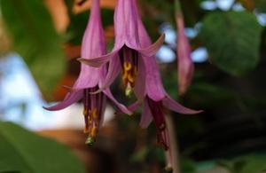 Fuchsia membranacea wurde 1876 durch William Botting Hemsley beschrieben. Die am Boden wachsenden Sträucher klettern bis 6 m, die epiphytisch wachsenden gar bis 10 m hoch. Die Knollen werden bis 20 mm gross, oft sind es aber auch nur verdickte Wurzeln. Die dünnen, schmal elliptisch-ovalen Blätter werden bis 10 cm lang. Blattspitze und -grund sind spitz zulaufend, der Blattrand ist glatt oder leicht gezähnt. Der Blattstand ist gegenständig. Pro Zweig wachsen bis 12 Blüten aus den Blattachseln oder als Büschel an der Zweigspitze. Die Blüten sind rosa bis rot und werden ca. 7.5 cm lang. Diese Art findet man in den feuchten Wäldern der Anden in Venezuela auf einer Höhe von 2'750 - 3'400 m. Der Name leitet sich her von den dünnen Blättern ohne jegliche Behaarung (lat. membranacea = dünnhäutig). Von diesen fünf beschrieben Arten sind die erst- und letztbeschriebene in den Niederlanden nicht vorhanden. In der nächsten Folge geht es weiter mit den letzten Arten dieser Sektion.