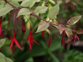 Es gibt noch weitere Varianten, aber die oben genannten sind die bekanntesten. Übrigens schreibt man botanische Namen immer kursiv. Normal geschriebene Namen mit großen Anfangsbuchstaben und zwischen einfachen Anführungszeichen bezeichen Hybriden oder Auslesen (= Kulturformen). Eine der bekanntesten ist F. magellanica 'Ricartonii', bei welcher man nicht sicher ist, ob es sich um eine Hybride handelt. Magellanicas sind einfach zu haltende Pflanzen mit geringen Ansprüchen an Standort und Erde. Zur Auspflanzen in den Garten nehmen Sie am besten zweijährige Pflanzen. Der Boden sollte locker und vor allem nicht nass sein. Zuviel Feuchtigkeit vermindert die Überwinterungschancen. Die Oberkante des Wurzelballens sollte ca. 10 cm unter die Gartenbodenoberfläche zu liegen kommen. Die Pflanzgrube muss nicht sofort gefüllt werden, das geschieht im Laufe des Jahres beim Scharren und Jäten. Je älter die Pflanze, desto eher verträgt sie Frost. Bei strengem Frost frieren die oberirdischen Teile ab, die Pflanze treibt aber im Frühjahr aus dem Wurzelstock wieder aus. Die alten Zweige schneiden wir erst im frühen Frühling zurück, so dass sie den Winter durch noch einen Schutz gegen die kalten Winde geben. Jedes Jahr werden mehr Zweige aus dem Boden kommen, so dass mit der Zeit ein schöner Strauch entsteht.