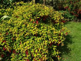 Meiner Meinung nach ist F. magellanica var. gracilis (= schlank, zierlich) eine der schönsten und blühfreudigsten Fuchsien. Von dieser Art kennen wir 3 Sports (Mutationen an einem Teil der Pflanze, die vegetativ vermehrt zu neuen Varietäten führen). F. magellanica var. versicolor mit hellgrünem Blatt mit cremefarbenen Rand, F. magellanica var. tricolori (= dreifarbig), hier mit einem graugrünen Blatt mit roter Marmorierung und ebenfalls cremefarbenem Rand. Die sehr frühen und die späten Jungtriebe sind wunderschön violettrot. Dann ist da noch F. magellanica var. aurea (= golden) mit gelbgrünen bis goldgelben Blättern, abhängig davon wie sonnig die Pflanze steht. Die Blühfreude dieser Blattvarietäten ist etwas minder, wird aber durch die Blattfarben gut kompensiert.